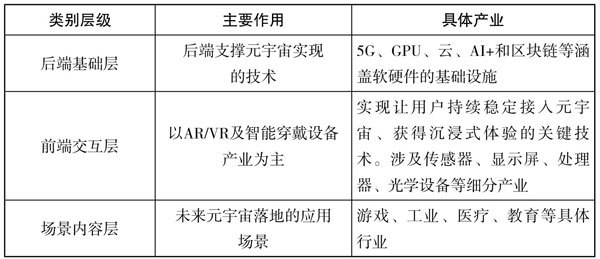 综合已有的资料与应用,元宇宙带来的新商业生态大致可分为3个层级(见表3-1),每层都有与其相对应的产业。