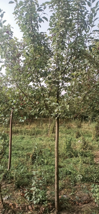 乔木,高达2~10米,稀14米;树冠宽阔,常有多数主干;小枝短粗,圆柱形,嫩时具短柔毛,二年生枝稍弯曲,无毛,暗灰红色,具生长圆形皮孔;冬芽卵形,先端钝,外被长柔毛,鳞片边缘较密,暗红色。叶片卵形、宽椭圆形、稀倒卵形,长6~11厘米,宽3~5.5厘米,先端急尖,基部楔形,稀圆形,边缘具圆钝锯齿,幼叶下面密被长柔毛,老叶较少,浅绿色,上面沿叶脉有疏生柔毛,深绿色,侧脉4~7对,下面叶脉显著;叶柄长1.2~3.5厘米,具稀疏柔毛;托叶膜质,披针形,边缘有白色柔毛,早落。花序近伞形,具花3~6朵。花梗较粗,长约1.5厘米,密被白色绒毛;花直径约3~3.5厘米;萼筒钟状,外面密被绒毛;萼片宽披针形或三角披针形,先端渐尖,全缘,长约6毫米,两面均被绒毛,内面较密,萼片比萼筒稍长;花瓣倒卵形,长1.5~2厘米,基部有短爪,粉色,含苞未放时带玫瑰紫色;雄蕊20,花丝长短不等,长约花瓣之半;花柱5,基部密被白色绒毛,与雄蕊约等长或稍长。果实大,球形或扁球形,直径3~4.5厘米,稀7厘米,黄绿色有红晕,萼洼下陷,萼片宿存,反折;果梗长3.5~4厘米,微被柔毛。花期5月,果期8~10月。