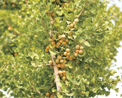 乔木,高可达40米,胸径可达4米;幼树树皮浅纵裂,大树之皮呈灰褐色,深纵裂,粗糙;幼年及壮年树冠圆锥形,老则广卵形;枝斜上伸展(雌株的大枝常较雄株开展);一年生的长枝淡褐黄色,二年生以上变为灰色,并有细纵裂纹;短枝密被叶痕,黑灰色;冬芽黄褐色,常为卵圆形,先端钝尖。叶扇形,有长柄,淡绿色,无毛,有多数叉状并列细脉,顶端宽5~8厘米,在短枝上常具波状缺刻,在长枝上常2裂,基部宽楔形,柄长3~10(多为5~8)厘米,幼树及萌生枝上的叶常较大而深裂(叶片长达13厘米,宽15厘米),有时裂片再分裂,叶在一年生长枝上螺旋状散生,在短枝上3~8叶呈簇生状,秋季落叶前变为黄色。球花雌雄异株,单性,生于短枝顶端的鳞片状叶的腋内,呈簇生状;雄球花葇荑花序状,下垂,雄蕊排列疏松,具短梗,花药常2个,长椭圆形,药室纵裂,药隔不发;雌球花具长梗,梗端常分两叉,稀3~5叉或不分叉,每叉顶生一盘状珠座,胚珠着生其上,通常仅一个叉端的胚珠发育成种子,风媒传粉。种子具长梗,下垂,常为椭圆形、长倒卵形、卵圆形或近圆球形花期3~4月,种子9~10月成熟。