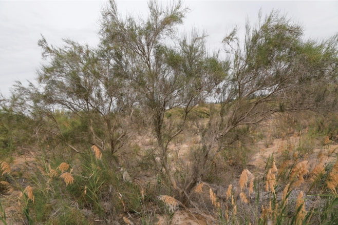 小乔木,高1~9米,树干地径可达50厘米。树皮灰白色,木材坚而脆;老枝灰褐色或淡黄褐色,通常具环状裂隙;当年枝细长,斜生或弯曲下垂,节间长4~12毫米,直径约1.5毫米。叶鳞片状,宽三角形,稍开展,先端钝,腋间具棉毛。花着生于二年生枝条的侧生短枝上;小苞片舟状,宽卵形,与花被近等长,边缘膜质;花被片5,矩圆形,先端钝,背面先端之下1/3处生翅状附属物;翅状附属物肾形至近圆形,宽5~8毫米,斜伸或平展,边缘波状或啮蚀状,基部心形至楔形;花盘不明显。胞果黄褐色,果皮不与种子贴生。种子黑色,直径约2.5毫米;胚盘呈上面平下面凸的陀螺状,暗绿色。花期5~7月,果期9~10月。