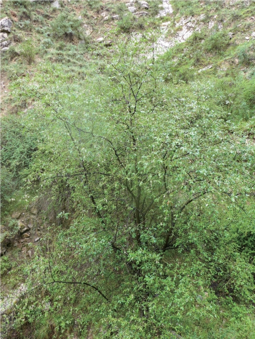 乔木,高可达20~30米,胸径达0.5~1米。树冠圆柱形;树皮褐灰色。小枝无毛,黄色带红色或紫红色,有白粉。芽扁卵形,长2~5毫米,有光泽,有一枚鳞片。叶长圆状披针形至披针形,长5~8厘米,宽1.5~2.3厘米,先端渐尖,基部楔形,两面无毛,上面灰绿色,下面苍白色,常有白粉,边缘稍有锯齿或近全缘;叶柄长5~7毫米;无托叶。花序先叶开放;雄花序开放时下垂,长1~(3)厘米,轴无毛,雄蕊5,短于苞片,着生于苞片基部,花药球形,黄色;苞片倒卵形,不脱落,外面无毛,边缘有长缘毛,无腺体;雌花序直立或斜展,长1~2.5厘米,轴无毛;子房近卵状长圆形,有短柄,无毛,花柱2,明显,每花柱具有2裂的柱头,脱落性;苞片倒卵状椭圆形,外面无毛,边缘有长毛,脱落。花期5月,果期6月。