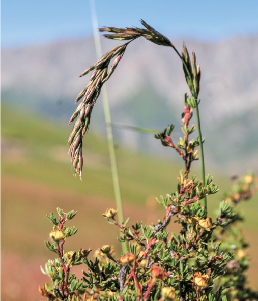 秆疏丛生,具短而下伸的根茎,直立或基部膝曲,高约70厘米,基部常被有少量白粉。叶鞘光滑;叶片扁平,粗糙或下面平滑,长4~12厘米,宽3~5毫米。穗状花序疏松,柔弱而下垂,长10~15厘米,通常每节具2枚小穗,有时接近先端各节仅具1枚小穗,穗轴边缘粗糙或具小纤毛;小穗灰绿色稍带紫色,长13~15毫米,含4~6小花;颖长圆状披针形或卵状披针形,具1~3脉,脉上粗糙,长3~4毫米,先端渐尖或具长仅1毫米的短尖头;外稃披针形,上部具显明的5脉,全部被短小微毛或有时背部平滑无毛,或边缘两侧被短刺毛,第一外稃长8~9毫米,顶端具粗糙的短芒,芒长(1)2~5毫米;内稃与外稃等长,先端钝圆或微凹陷,脊上具纤毛,至下部毛渐不显,脊间被微毛。