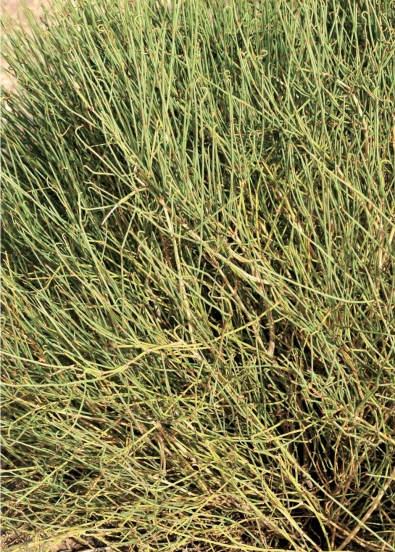 草本状灌木,高20~40厘米;木质茎短或成匍匐状,小枝直伸或微曲,表面细纵槽纹常不明显,节间长2.5~5.5厘米,多为3~4厘米,径约2毫米。叶2裂,鞘占全长1/3~2/3,裂片锐三角形,先端急尖。雄球花多成复穗状,常具总梗,苞片通常4对,雄蕊7~8,花丝合生,稀先端稍分离;雌球花单生,在幼枝上顶生,在老枝上腋生,常在成熟过程中基部有梗抽出,使雌球花呈侧枝顶生状,卵圆形或矩圆状卵圆形,苞片4对,下部3对合生部分占1/4~1/3,最上一对合生部分达1/2以上;雌花2,胚珠的珠被管长1毫米或稍长,直立或先端微弯,管口隙裂窄长,约占全长的1/4~1/2,裂口边缘不整齐,常被少数毛茸。雌球花成熟时肉质红色,矩圆状卵圆形或近于圆球形,长约8毫米,径6~7毫米;种子通常2粒,包于苞片内,不露出或与苞片等长,黑红色或灰褐色,三角状卵圆形或宽卵圆形,长5~6毫米,径2.5~3.5毫米,表面具细皱纹,种脐明显,半圆形。花期5~6月,种子8~9月成熟。
