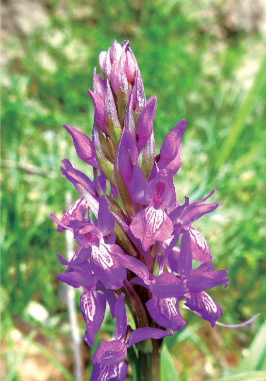 陆生兰,高14~40厘米。块茎粗大,肉质,圆柱状,下部3~5掌 裂。叶3~6枚,互生,长椭圆形至披针形,端钝、渐尖或长渐尖。花葶直立,粗壮,无毛,总状花序具几朵至十余朵花,长2~10厘米;花苞片披针形,长渐尖,最下部的长于花;花紫红色,较大,不偏向一侧,萼片近等大,较花瓣大,顶端钝,长8毫米,宽3毫米,中萼片长椭圆形,侧萼片狭卵状长椭圆形;花瓣狭卵形,顶端钝;唇瓣卵圆形,稍长于萼片,顶端钝圆,边缘全缘或具锯齿,不裂或微3裂;距长于或稍短于子房;子房扭曲;合蕊柱短。