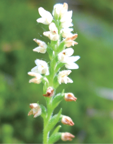 植株高10~25厘米。根状茎伸长,茎状,匍匐,具节。茎直立,绿色,具5~6枚叶。叶片卵形或卵状椭圆形,长1~2厘米,宽5~15毫米,上面深绿色具白色斑纹,背面淡绿色,先端急尖,基部钝或宽楔形,具柄,叶柄长5~10毫米,基部扩大成抱茎的鞘。花茎直立或近直立,被白色腺状柔毛,具3~5枚鞘状苞片;总状花序具几朵至10余朵、密生、多少偏向一侧的花,长4~15厘米;花苞片披针形,长5毫米,先端渐尖;子房圆柱状纺锤形,连花梗长4毫米,被疏的腺状柔毛;花小,白色或带绿色或带粉红色,半张开;萼片背面被或多或少腺状柔毛,具1脉,中萼片卵形或卵状长圆形,长3~4毫米,宽1.2~1.5毫米,先端钝,与花瓣粘合呈兜状;侧萼片斜卵形、卵状椭圆形,长3~4毫米,宽1.5~2.5毫米,先端钝;花瓣斜匙形,无毛,长3~4毫米,宽1~1.5毫米,先端钝,具1脉;唇瓣卵形,长3~3.5毫米,基部凹陷呈囊状,宽2~2.5毫米,内面无毛,前部短的舌状,略外弯;蕊柱短,长1~1.5毫米;蕊喙直立,长1.5毫米,叉状2裂;柱头1个,较大,位于蕊喙之下。花期7~8月。