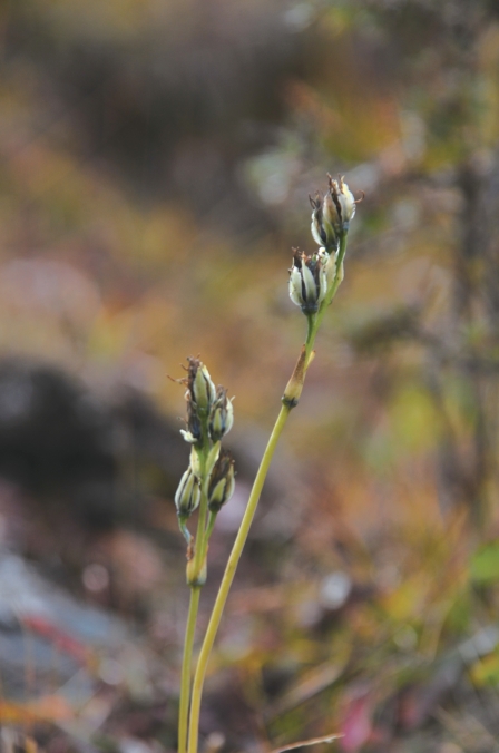 植株高8~30厘米。块茎卵圆形或卵状长圆形,长0.8~2厘米,直径5~10毫米,肉质。茎细长,直立或近直立,无毛,基部具2枚筒状鞘,其上具1枚较大的叶,在叶之上有2~7枚、苞片状卵状披针形的小叶。大叶1片,直立伸展,线形或线状长圆形,长4~12厘米,宽6~8毫米,先端急尖,基部收狭成抱茎的鞘。总状花序具几朵至30余朵花,长1.5~11厘米,圆柱状;花苞片卵形,直立伸展,长1.5~2毫米,先端渐尖,基部凹陷,短于子房;子房圆柱状纺锤形,扭转,无毛,连花梗长约5毫米;花小,黄绿色,疏生或较密生;中萼片卵形,直立,凹陷呈舟状,长1.5毫米,宽约1.3毫米,先端钝,具1脉;侧萼片稍张开,偏斜的长圆形,长2毫米,宽约1毫米,先端钝,具1脉;花瓣直立,凹陷,偏斜的长圆形,较中萼片稍短,与中萼片相靠,先端极钝,具1脉;唇瓣轮廓为长圆形,凹陷,肉质增厚,长2.3~2.5毫米,中部缢缩,基部凹陷呈浅囊,先端3浅裂,侧裂片镰状三角形,先端近急尖,中裂片较侧裂片稍宽和近等长;蕊柱粗,长约1毫米;药室并行;花粉团圆球形,具短的花粉团柄和粘盘,粘盘卵圆形;蕊喙小;柱头2个,隆起,棒状长圆形,从蕊喙之下伸出,贴生于两侧壁上;退化雄蕊2个,小,横椭圆形。花期8~9月。