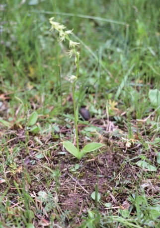 植株高5.5~35厘米。块茎球形,直径6~10毫米,肉质。茎直立,无毛,基部具2枚筒状鞘,下部具2~3枚叶,在叶之上具1~2枚苞片状小叶。叶片狭椭圆状披针形或狭椭圆形,直立伸展,长2.8~10厘米,宽8~25毫米,先端急尖,基部渐狭并略抱茎。总状花序具多数花,圆柱状,长达15厘米;花苞片线状披针形,长2.5毫米,宽约1毫米,先端长渐尖,尾状,直立伸展;子房圆柱状纺锤形,扭转,顶部明显钩曲,无毛,连花梗长4~5毫米;花小,黄绿色,垂头,萼片近等长,具1脉;中萼片椭圆形或长圆状披针形,长2.2毫米,宽1.2毫米,先端钝;侧萼片长圆状披针形,宽约1毫米,较中萼片稍狭,先端稍尖;花瓣近菱形,上部肉质增厚,较萼片稍长,向先端渐狭,或在中部多少3裂,中裂片线形,先端钝,具1脉;唇瓣与花瓣等长,肉质增厚,基部凹陷呈浅囊状,近中部3裂,中裂片线形,长1.5毫米,侧裂片三角形,较中裂片短很多;蕊柱粗短,长不及1毫米;药室并行;花粉团近圆球形,具极短的花粉团柄和粘盘,粘盘较大,卷成角状;蕊喙矮而阔;柱头2个,隆起,叉开,位于蕊喙之下;退化雄蕊2个,近三角形,先端钝,显著。花期6~8月。
