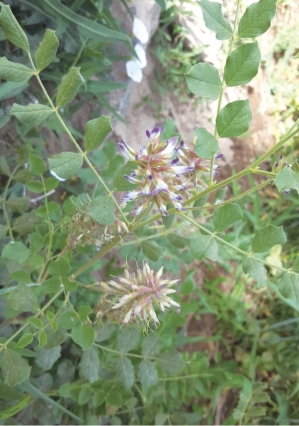 多年生草本;根与根状茎粗壮,直径0.5~3厘米,根皮褐色,里面黄色,具甜味。茎直立而多分枝,高0.5~1.3米,基部带木质,密被淡黄色鳞片状腺点和白色柔毛,幼时具条棱,有时具短刺毛状腺体。叶长5~14厘米;托叶线形,长仅1~2毫米,早落;叶柄密被黄褐腺毛及长柔毛;小叶11~17枚,卵状长圆形、长圆状披针形、椭圆形,长1.7~4厘米,宽0.8~2厘米,上面近无毛或疏被短柔毛,下面密被淡黄色鳞片状腺点,沿脉疏被短柔毛,顶端圆或微凹,具短尖,基部近圆形。总状花序腋生,具多数密生的花;总花梗短于叶或与叶等长(果后延伸),密生褐色的鳞片状腺点及白色长柔毛和绒毛;苞片披针形,膜质,长约2毫米;花萼钟状,长5~7毫米,疏被淡黄色腺点和短柔毛,萼齿5枚,披针形,与萼筒近等长,上部的2齿大部分连合;花冠紫色或淡紫色,长9~12毫米,旗瓣卵形或长圆形,长10~11毫米,顶端微凹,瓣柄长为瓣片长的1/2,翼瓣长8~9毫米,龙骨瓣直,长7~8毫米;子房无毛。荚果长圆形,扁,长1.7~3.5厘米,宽4.5~7毫米,微作镰形弯,有时在种子间微缢缩,无毛或疏被毛,有时被或疏或密的刺毛状腺体。种子2~8颗,暗绿色,光滑,肾形,直径约2毫米。花期5~6月,果期7~9月。