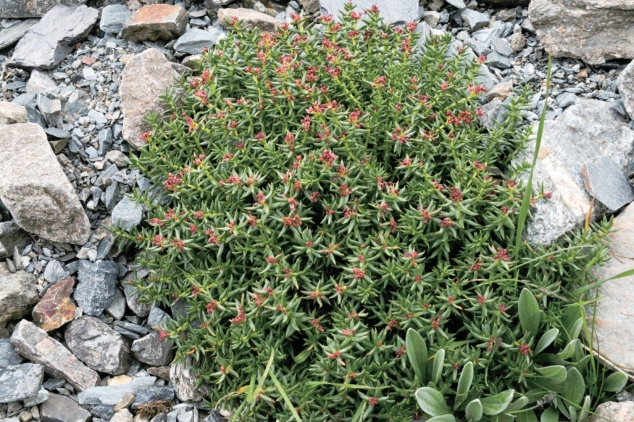 多年生草本。主根粗长,根颈没有残留老枝茎,或有少数残留,先端被三角形鳞片。雌雄异株。雄株花茎干后稻杆色或老后棕褐色,高10~17厘 米,直 径1.5~2.5毫 米。叶 线形,长1~1.5厘米,宽不及1毫米,先端钝渐尖,无柄。花序紧密,伞房状,花序下有苞叶;萼片5,线状长圆形,长2~3毫米,宽0.5~0.6毫米,先端钝;花瓣5,干后似为粉红色,长圆状披针形,长4毫米,宽0.8毫米,先端钝渐尖;雄蕊10,对瓣的长2.5毫米,在基部上1.5毫米着生,对萼的长4.5毫米,鳞片5,四方形,长0.4毫米,宽0.5毫米,先端有微缺;心皮5,狭披针形,长2.5毫米,不育。雌株花茎果时高15~30厘米,直径3毫米,棕褐色。叶线形,长8~13毫米,宽1毫米,先端钝渐尖。花序伞房状,果时倒三角形,长宽各5厘米;萼片5,线状长圆形,长3~3.5毫米,宽0.5~0.7毫米,钝;花瓣5,长圆状披针形,长5毫米,宽1~1.2毫米,先端钝渐尖;鳞片5,横长方形,长0.5毫米,宽0.7毫米,先端有微缺;蓇葖5,直立,狭披针形,长达1厘米,喙短,长1毫米,直立或稍外弯。花期5~8月,果期8月。