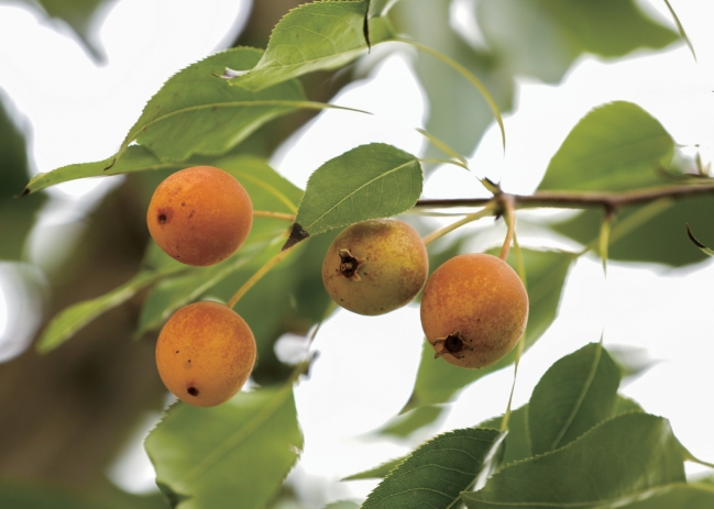 落叶乔木,高达8~15米;小枝幼时具白色绒毛,二年生枝条紫褐色,无毛;冬芽长 卵形,先端圆钝,鳞片边缘具绒毛。叶片椭圆卵形至长卵形,长6~10厘 米,宽3.5~5厘米,先端具长渐尖头,基部宽楔形,边缘有尖锐锯齿,齿尖向外,幼时有稀疏绒毛,不久全部脱落;叶柄长2~6厘米,微被柔毛或近于无毛;托叶膜质,线状披针形,边缘有稀疏腺齿,内面有稀疏绒毛,早落。伞形总状花序,有花5~8朵,总花梗和花梗嫩时具绒毛,逐渐脱落,花梗长2~2.5厘米;苞片膜质,线状披针形,很早脱落。花直径约3厘米;萼筒外面具白色绒毛;萼片三角披针形,长约2~3毫米,内面密被绒毛;花瓣卵形,长1~1.5厘米,宽0.8~1.2厘米,基部具有短爪,白色;雄蕊20,长约花瓣之半;花柱3~4,稀2,基部无毛。果实球形或卵形,直径2~3.5厘米,褐色,有斑点,萼片脱落;果梗长2~4厘米。花期4月中旬,果期8~9月。