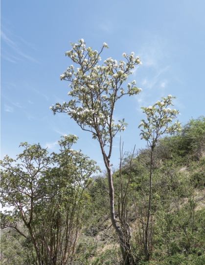 灌木或小乔木,高达5米;小枝粗壮,圆柱形,褐色或灰褐色,有皮孔,嫩枝红褐色,微具短柔毛;冬芽大,长卵形,先端渐尖,有数枚褐色鳞片,外被白色柔毛。奇数羽状复叶,连叶柄长14~17厘米,叶柄长1.5~3.3厘米;小叶片(4)6~7对,间隔1.5~2厘米,顶端和基部的稍小,卵状披针形,长5~7厘米,宽1.2~2厘米,先端渐尖,基部偏斜圆形或宽楔形,边缘大部分有锐锯齿,仅基部全缘,两面无毛,下面色较浅;叶轴微具窄翅,上面有沟,无毛;托叶线状披针形,膜质,早落。复伞房花序大形,有多数花朵,排列疏松,无毛;花梗长4~8毫米;花直径15~18(20)毫米;萼筒钟状,内外两面均无毛;萼片三角形,先端钝,稀急尖,外面无毛,内面有白色柔毛;花瓣卵形或椭圆形,长6~9毫米,宽5~7毫米,先端圆钝,白色。内面微具白色柔毛;雄蕊15~20,通常20,长约为花瓣之半或更短;花柱3~5,通常5,稍短于雄蕊或几乎等长,基部密被白色绒毛。果实球形,直径10~12毫米,鲜红色,先端具宿存闭合萼片。花期5~6月,果期9~10月。