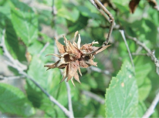 灌木,高1~3米,树皮浅灰色;枝条灰褐色,无毛,密生皮孔;小枝褐色,具条棱,密被短柔毛,疏生皮孔;芽卵状,细小,长约2毫米,具数枚膜质、被短柔毛、覆瓦状排列的芽鳞。叶卵形或椭圆状卵形,长2~6.5厘 米,宽1.5~5厘 米,顶端渐尖或锐尖,基部心形、斜心形或几圆形,边缘具重锯齿,中部以上具浅裂;上面绿色,多少被短柔毛,下面淡绿色,密被褐色腺点,疏被短柔毛,侧脉7~9对,上面微陷,下面隆起,密被短柔毛,脉腋间具簇生的髯毛;叶柄长3~12毫米,密被短柔毛。雄花序单生于小枝的叶腋,倾斜至下垂,短圆柱形,长1~2厘米,直径约4毫米;花序梗不明显;苞鳞宽卵形,外面疏被短柔毛。果4枚至多枚排成总状,下垂,着生于当年生小枝顶端;果梗短(有时不明显);序梗细瘦,长可达2.5厘米,密被短柔毛,间有稀疏长硬毛;果苞厚纸质,长1~1.5厘米,下半部紧包果实,上半部延伸呈管状,外面密被短柔毛,具条棱,绿色带紫红色,成熟后一侧开裂,顶端4浅裂,裂片长达果苞的1/4~1/3。小坚果宽卵圆形或球形,长5~6毫米,直径4~6毫米,褐色,有光泽,疏被短柔毛,具细肋。