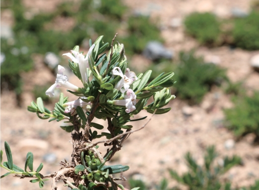 落叶矮小灌木,高12~40厘米,老枝多节,下部者平卧,幼枝极短,直立向上,密被肉眼难见的微柔毛,后变秃净。冬芽小,长约2毫米,卵圆形,顶尖,有数对鳞片,最下一对几乎包住整个芽体。叶质地厚硬,卵形、矩圆状卵形或卵状椭圆形,长7~20毫米,顶端短渐尖,基部圆楔形或圆形,初时两面密被硬伏毛,后毛渐变稀而留有散生的疣状突起,有时兼具腺毛,边缘有硬毛,叶脉在两面均显著;叶柄长1.5~2.5毫米,基部扩大而相连,密被长硬毛。总花梗出自幼枝基部叶腋,花时不发育,果时长2~5毫米,除被微柔毛外还有短伏毛和具短柄的腺毛;苞片卵形,较少卵状披针形,长6~11毫米,基部宽而包围萼筒,内外两面均被腺毛,边缘具硬毛;萼筒无毛或具细腺毛,萼檐长约1毫米,比萼筒短1/2,浅裂为不等的5宽齿,疏生长睫毛;花冠长15~20毫米,外面疏生开展的毛,筒细,喉部以上扩大,基部以上处具距状突起,上唇裂片卵形或几近半圆形,下唇长圆形,稍伸展;雄蕊短于上唇1/3~1/4;花柱略短于雄蕊。果实鲜红色,具蓝灰色粉霜,倒披针状卵圆形,长5~8毫米。花期6月,果熟期7~8月。