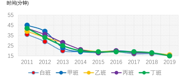 该微巴在改进方面得到提升、突破后,及时采用SOP固化各项改进措施并展开培训,员工作业效率提升较为明显。吐丝盘更换作业SOP修订并培训后,各班平均作业耗时稳中有降,基本趋于一致,实现了“不管谁来更换吐丝盘,结果都一样”的良好局面。参见图2-6、图2-7。
