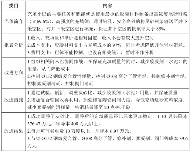 案例2-11:南钢集团某矿山充填小巴阿米巴改进成果展示(如表2-15)
