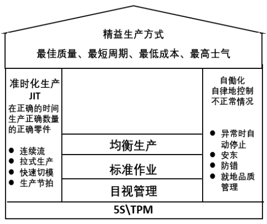 组织追求精益的过程,实质上就是一个持续改进的过程,而且是一个长期的过程,一场只有起点、没有终点的比赛。改善过程需要综合应用现场管理、设施布置与优化、工业工程、作业研究、质量控制与保证、流程管理与控制、智能制造、AI等技术一系列方法与工具,因此精益生产也是一个包含了多种制造技术和管理技术的综合体系。该体系由5S、TPM、目视管理、标准作业、均衡生产等基础性管理活动,以及准时化生产和自慟化两大支柱构成。参见图4-1。