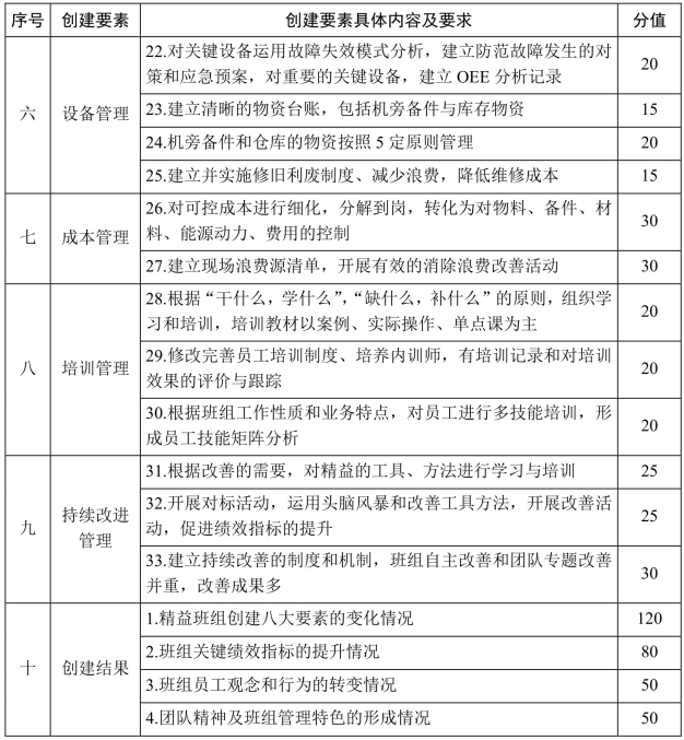 建立员工自主改善的机制。员工对现场和管理中存在的问题,能够及时识别和改进,形成班组PDCA(计划、执行、检查、行动)和SDCA(标准化、执行、检查、总结)相结合的持续改善机制。精益班组创建要素与评价要求详见表5-4。