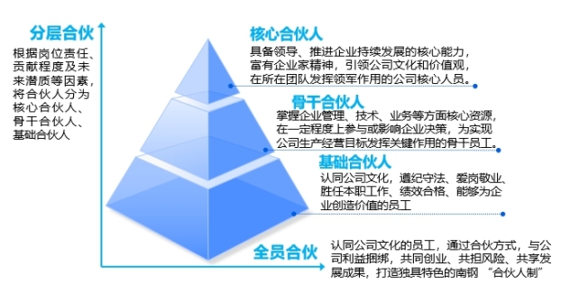 分层合伙:根据岗位责任、贡献程度及未来潜质等因素,将合伙人分为核心合伙人、骨干合伙人、基础合伙人。规范和完善公司内部的治理机制,建立分类分级授权机制,规范合伙人之间的权利、义务,协调合伙人的责任、利益和风险平衡关系。