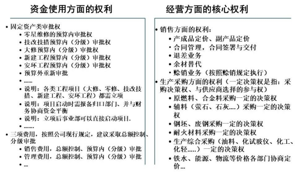以充分向事业部大巴授权赋权的原则,南钢将机关部室能够下沉的职能不断向事业部分权,机关部室已由“管理+控制”向“服务+监管”转移。集团总部主要掌握公司战略制订权、主要管理干部的人事任免权、薪酬制度制订权、重大投资决策权、对外投资和资本运营权等,其他权力和职责全部下放,参见图11-5。