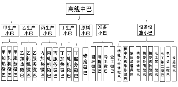高线中巴由甲、乙、丙、丁生产小巴、原料小巴、准备小巴、设备设施小巴等7个小巴、27个微巴组成,组织架构见图13-1。