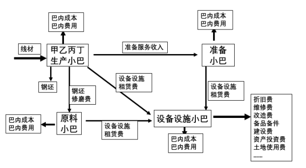 原料小巴、准备小巴、设备设施小巴为服务巴。向生产巴收取服务费形成收入。
