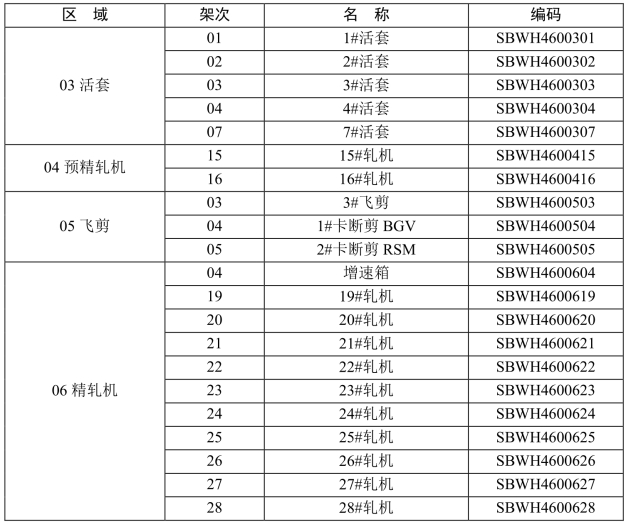 精轧机维修微巴负责经营和管理表13-3所列区域内的设备资产,通过维护、维修、保养和提升现场管理水平等方法,为轧机微巴提供这些设备的租赁服务、各项保障、改善协同、技术攻关、环境提升、安全防护等。