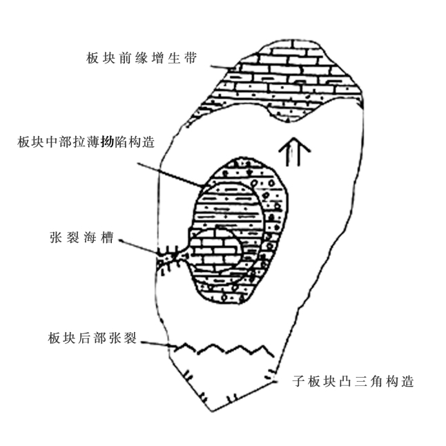 板块中部主要承受拉张力,一般产生张性或张扭性的断裂带。当这个拉张力十分强大而又持续很久,却又不足以使板块分离时,则会在板块中部产生拉薄拗陷构造(图2-2)。泥盆纪初,华北、扬子和华夏等板块连成一体,从冈瓦纳大板块上分离出来向北移动,在板块中部形成了强大的拉张力,使得扬子板块与华夏板块原先的碰撞隆起带,即南岭碰撞隆起带一带的地壳被拉薄形成拗陷,成为沉积盆地,即湘桂盆地,海水由西南沿钦防海槽进入盆地中心。作为盆地中心的广西、湘南一带,原为南岭隆起带附近区域,下陷后沉积了碳酸盐岩。由盆地中心向东、向北为碎屑沉积。早石炭世末,华北板块与扬子板块分离后,扬子板块南部才结束了碎屑沉积,而在扬子板块与华北板块之间则形成古特提斯海,扬子板块的北侧则形成碳酸盐沉积,即为南华板块前缘增生带的沉积。原拉薄拗陷的湘桂盆地中心区,拉张力虽然减小,但仍然存在。受拉张力的作用,中心区处形成张性的断裂,其特征是在湖南晚石炭世的盐酸盐沉积中产生凸凹相间的台地与槽地沉积。