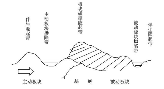 按压力方向,板块碰撞构造又可分为两种类型:其一是两个主动板块发生碰撞对接,形成主动板块碰撞构造;其二是主动板块与被动板块发生碰撞对接,形成主被动板块碰撞构造。这两种板块碰撞构造既有相似之处,又有很大的差别。