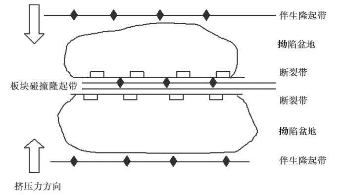 主动板块与主动板块碰撞隆起构造,两个板块的前缘会相对涌起,形成碰撞隆起带。在隆起带的两侧发育有两个基本对称的拗陷盆地。盆地与隆起带之间往往发育断裂带,与隆起带平行。断裂带起初应为张裂带,以后可能演变成压扭性的。在拗陷盆地的另一侧会有一个伴生隆起带,它既是拗陷盆地的边缘,也是板块碰撞构造的边缘,所以又称为边缘隆起带。两个伴生边缘隆起带之间,构成了主动板块碰撞构造的完整系统(图2-3)。