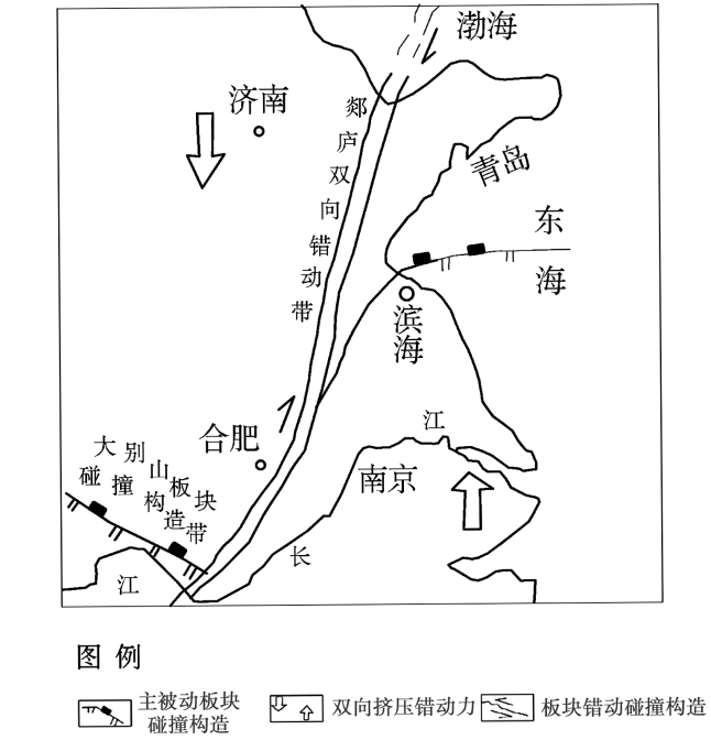 双向错动构造是指两个板块朝相反的方向移动,发生错动而形成的构造。目前双向错动构造发现较少,只在板块碰撞构造的局部,发现有此类错动构造,即为郯庐错动构造(图2-6)。