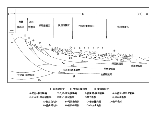 雪峰山推覆构造是雪峰山隆起带沿地幔滑脱面向北西推覆形成的。在其带动下,上覆地层也沿不同深度的滑脱面向北西推覆,依次有基底滑脱面、深层滑脱面和浅层滑脱面,对应形成推覆顶峰区、基底推覆区、深层推覆区和浅层推滑相间区,在浅层滑脱面上又派生出浅层推滑相间构造和滑覆构造[18]。
