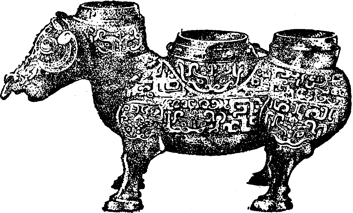 一九二三年山西浑源李峪村晋墓出土,《浑源彝器图》、《中国古青铜选·上海博物馆藏青铜器》著录,现藏上海博物馆。高三十三点七厘米。牛鼻穿有鼻环。背上有三个圆孔,每个圆孔上安放有(锅子),是温酒用的。
