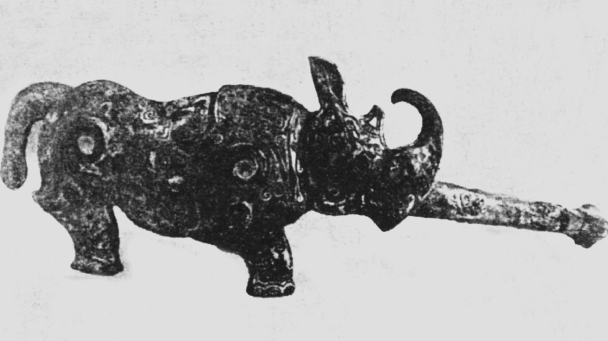 带钩是束腰皮带上的钩,原为“胡服”所用,称为鲜卑或师比、胥纰、犀毗等等。战国时中原各诸侯国进行军事改革,讲究骑射,逐渐改用“胡服”作武装,带钩也渐盛行。其制一端曲首,背有圆钮。多数用青铜制作,也有铁制的。精致的铸有各种图案花纹,有整个作动物形的。此件四川广汉出土,作犀牛形,并有错银图案。犀牛是当时西南特产。