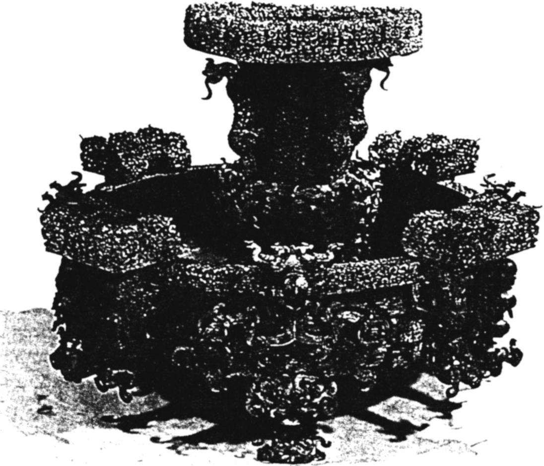 一九七八年湖北随县擂鼓墩曾侯乙墓出土的青铜器群,可以说,代表着当时青铜铸造技术的高峰,主要表现有下列三点:(一)合范法(复合陶范合铸法)的熟练使用。如曾侯乙墓所出整套编钟大小不同,形制纹饰极其繁复,都能用合范法合铸成功,其中层甬钟的铸件,估计是用一百三十六块芯、范组成的。(二)铸接和焊接的适当使用。如曾侯乙墓所出建鼓座,大小龙群穿插纠结地蟠绕着座体,构成十分繁复生动的立体形象,估计是用二十二件铸件及十四件接头,适当地采用铸接和焊接的方法加以联结,并接合在座体上面。(三)“熔模铸造法”的精巧使用。如曾侯乙墓所出尊和盘(尊在盘中),尊唇和盘口布满着精细而镂空的立体蟠螭纹和蟠虺纹,内部由多层铜梗联结而支承,只有用“熔模铸造法”才能铸成。研究者对此有两种不同估计,或者认为使用“失蜡法”,是用蜡(主要是蜂蜡)作为熔模的[1];或者认为使用“漏铅法”,是用铅作为熔模的[2]。一九七九年河南淅川下寺的楚墓中出土的铜禁,所饰镂空的多层云纹,与曾侯乙墓所出尊和盘的蟠螭纹结构相似,同样是用“熔模铸造法”的,时代要比曾侯乙墓早一百多年,说明这种铸造法至少在春秋后期已经使用,因而到战国前期已很成熟了。