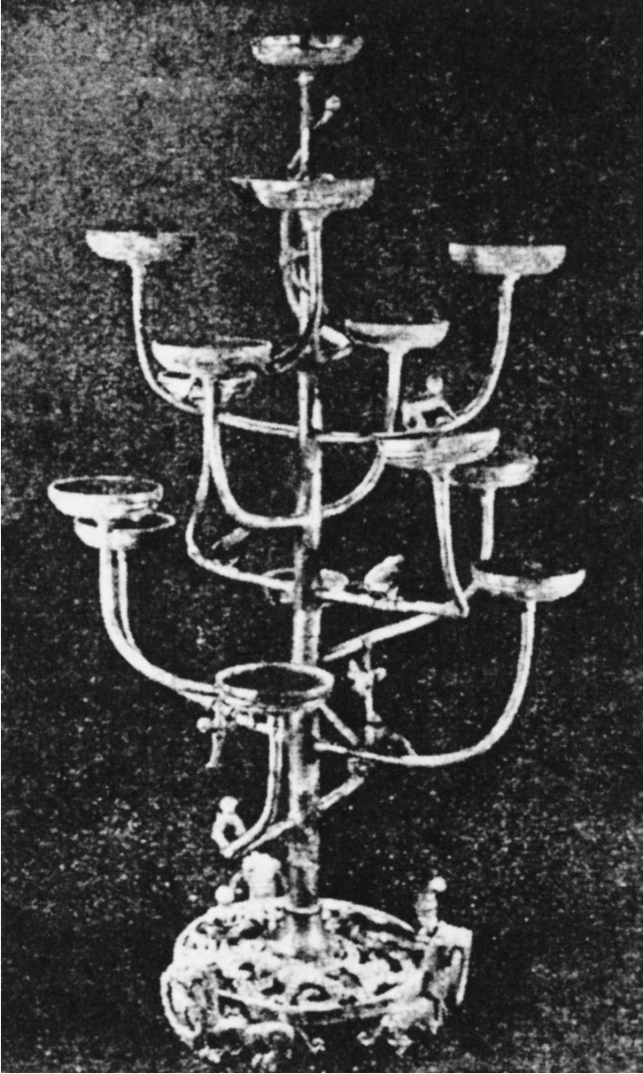 一九七八年河北平山中山王墓出土。高八十四点五厘米。由大小八节连接构成。每节都有榫铆,榫口各异,移动时便于拆卸和安装。灯枝上有群猴游戏,并有金乌啼鸣。底盘上有两个上身裸露、下穿短裳的男子,正在向上抛食物引弄猴子。