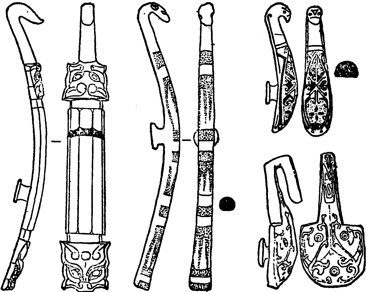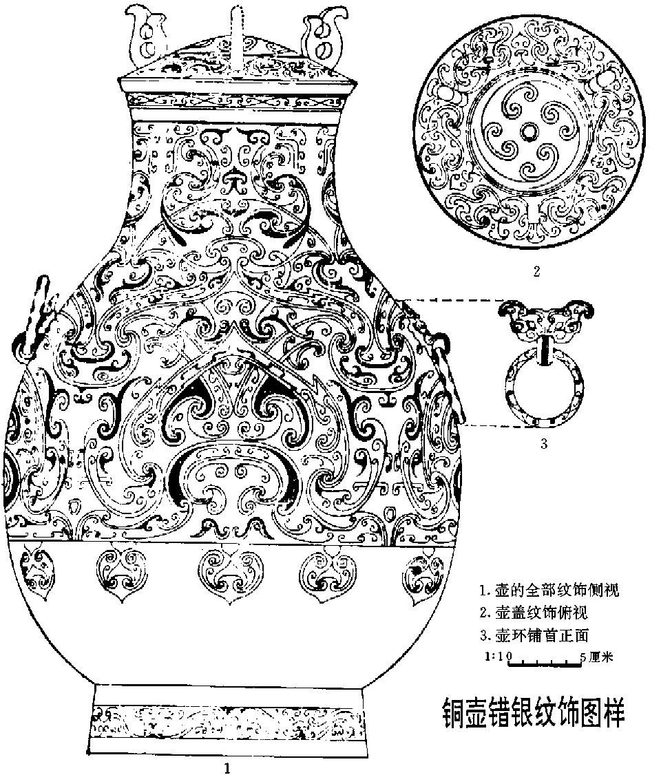 附带要指出,这时出现有槌制的薄胎的红铜器,大都是盛水器,常有用针刺刻的图画,多为宫殿建筑、宴乐歌舞,也有神话色彩的人物或鸟兽。