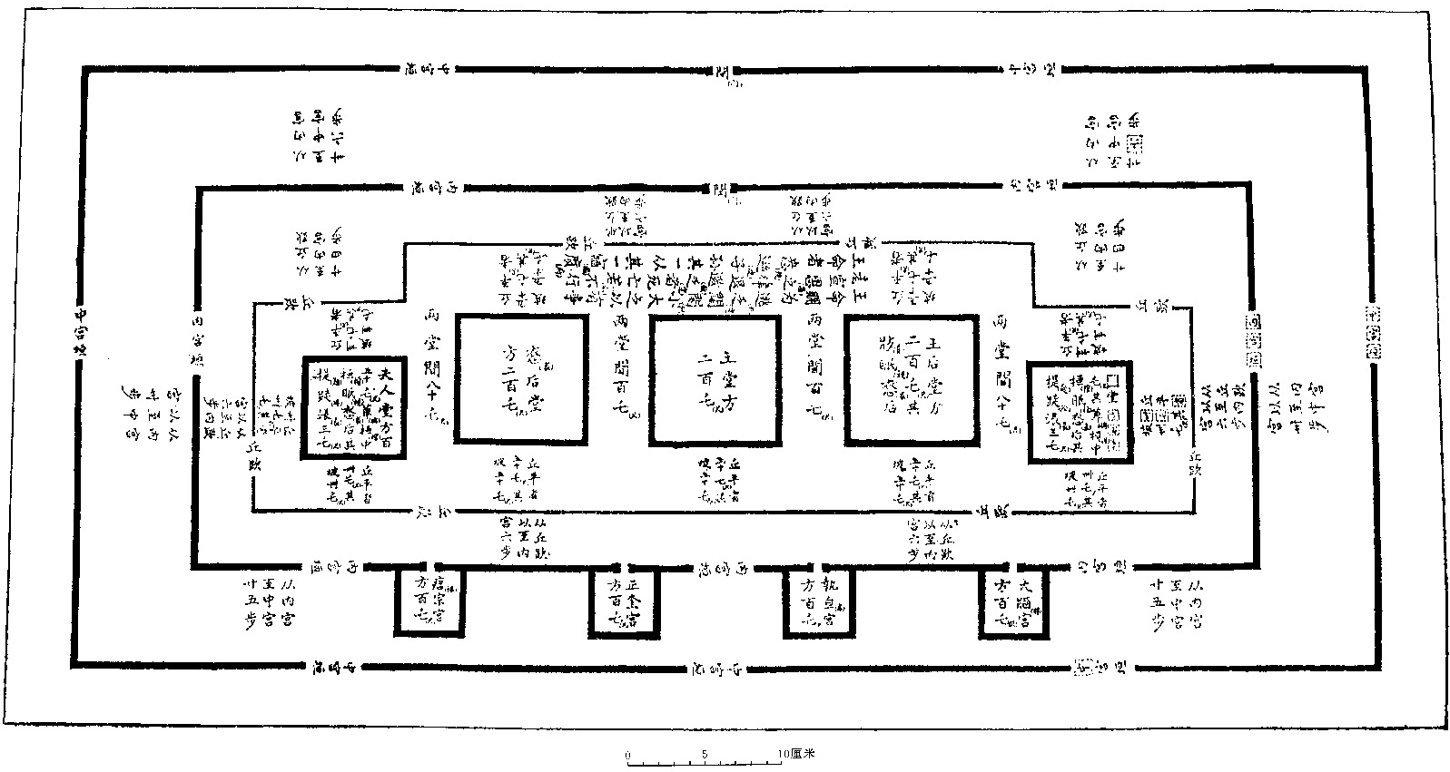 ”以内设计建筑五个“堂”,“堂”就是建筑在封土上的“寝”。中心的是王堂,王堂的两侧是王后堂和哀后堂(王后指今后,哀后指先死的后),王堂、王后堂、哀后堂都“方二百尺”。在王后堂的右侧是“□(字不清)堂”,在哀后堂的左侧是夫人堂。□堂和夫人堂都“方百五十尺”。这五座“堂”的中间也都规定有一定距离。现在发掘的中山一号和二号墓,都有覆斗形封土,封土下部有平台彼此相连,封土半腰都有一圈方形的回廊建筑,一号墓保存较好,以外檐面积计算约为五十二米见方,和《兆域图》所记王堂方二百尺面积相近。由此可见当时国王陵园的建筑规模。