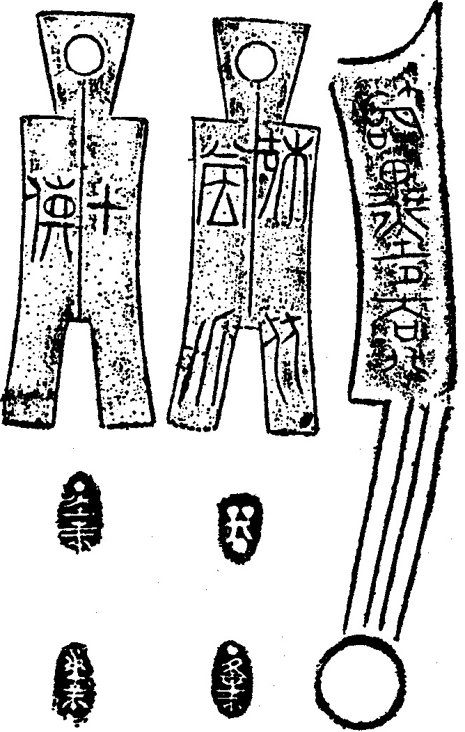铜币的四种形式 春秋后期,已有铜铸货币的出现。公元前五二四年(周景王二十一年)曾铸“大钱”。在这以前早已有钱,而且有两种不同币值,或者“母权子而行”,或者“子权母而行”。这时周景王铸“大钱”,是为了“废轻而作重”(《国语·周语下》)。这种称为“钱”的铜币,是从称为“钱”(即铲)的农具转变来的。这种铜币又称为“布”,又是“镈”(即锄)的假借字。十分清楚,铜币是模仿“钱”和“镈”等青铜农具形式铸造的。原始的“钱”,古钱学家称为“空首布”,或称“铲币”。所谓“空首”,指首部有装柄的圆孔,如同铲的“銎”。春秋后期周的王城周围地区流行的空首布,有大型平肩、小型平肩和小型斜肩等三种,近年河南洛阳、伊川、新安、孟津、宜阳等地先后有多批出土,布上铸有十多个周的地名,大型和小型平肩布铸有“王”字的,当是王城所铸。春秋后期晋国太行山以北地区流行着耸肩尖足空首布,一九五四年山西侯马牛村古城南部曾出土十二枚。当为晋的都城所铸。传世这种布铸有甘丹地名,当为邯郸所铸。