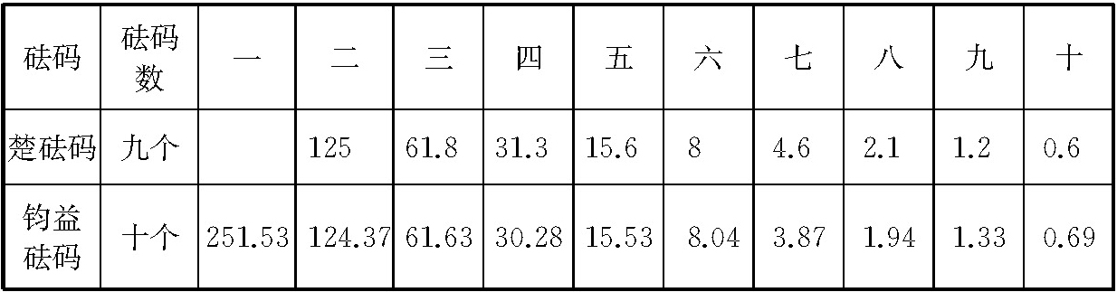 楚国的度量衡制,和秦国很接近。传长沙和寿县出土的楚国铜尺,长二十二点五和二十三厘米。传寿县朱家集出土楚铜量,据实测,左器容一千零八十毫升,右器容二百毫升,左器是右器的五倍。可能右器是一升量,左器是五升量。一九五四年长沙左家公山出土楚国木质天平秤和铜盘及铜砝码九个,重量依次减半。一九四五年长沙近郊也曾出土铜砝码十个一套,重量依次减半。第二枚上有“钧益”刻铭。一九五九年安徽凤台出土铸造砝码的铜范,说明楚的砝码是成套用铜范制造的。据实测的结果是: