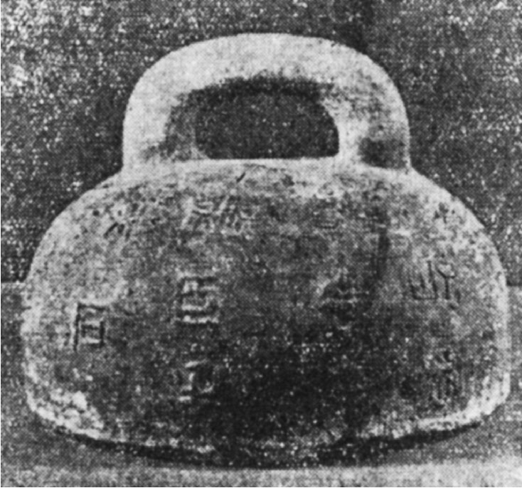 ,人名。殹事,县名,“命”即“令”,县官名;代熭,人名。以上两人为此权的监造者。下库工师,工官名;孟,人名。此为主造者。关师四人,乃实际铸造者。根据刻铭字体和内容,此权应为三晋之器。禾石为一百二十斤。据实测,重三万零三百五十克,折合每斤为二百五十二点九克。根据器形及残纽痕迹,补足残纽,权约重三万零九百七十克,折合每斤约二百五十八克。