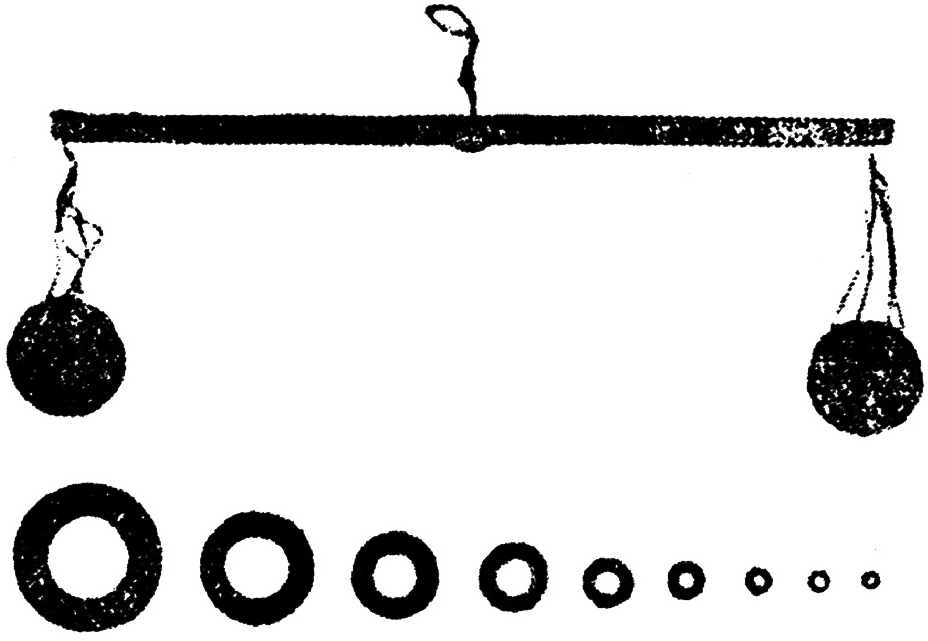 长沙左家公山战国墓葬出土。天秤的木杆长二十七厘米,中间有丝线提纽,长十三点五厘米。离杠杆两端零点七厘米处,系有两个铜盘,盘径大四厘米,盘上丝线长九厘米。砝码共大小九个。