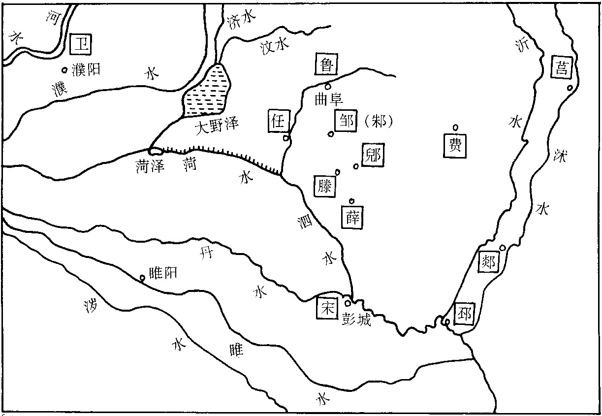 当时有所谓“泗上十二诸侯”(见《田世家》及《韩诗外传》卷十第六章等),指泗水两侧地区存在着十二个小国。《史记·秦本纪》于孝公元年,论及当时形势,讲到“河山以东强国六”,“淮泗之间小国十余”。《楚策一》第十八章张仪游说楚王,谓楚王“举宋而东指,则泗上十二诸侯尽王之有已”。《史记·张仪列传》同。《索隐》谓“十二诸侯,宋、鲁、邾、莒之比也”。胡三省《通鉴注》说:“宋、鲁、邹、滕、薛、郳等国,国于其间,齐威王所谓泗上十二诸侯。”所谓泗上十二诸侯,当指宋、卫、鲁、邹、滕、薛、郳、莒、费、郯、任、邳等十二国[6]。