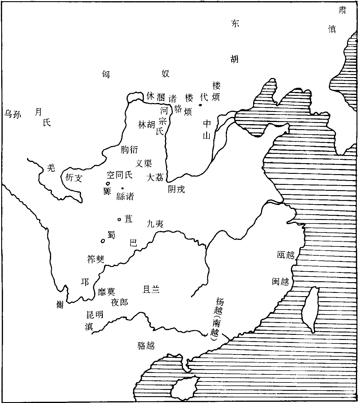 少数部族在中原地区建立的国家,只有中山,在今河北省西部高邑、宁晋、元氏、赵县、石家庄、灵寿、平山、行唐、曲阳、唐县、定县一带。春秋时称为鲜虞,原为白狄族。战国初年魏文侯攻取中山,但由于中山和魏国之间,隔着赵国,中山不久就摆脱魏的控制而复国。在楚国地区内,也还保留不少少数部族,在今湖北省东北部山区有所谓“九夷”,即李斯《谏逐客书》所说“南取汉中,包九夷,制鄢、郢”的“九夷”;在今泗水淮水和长江之间也还有“九夷”,即苏代与燕昭王书中所说的“九夷方七百里”(《史记·苏秦列传》,“九夷”原误作“北夷”,从王念孙《读书杂志》改正)。这个“九夷”,就是淮夷,直到秦完成统一后,才和华夏族融合[9]。