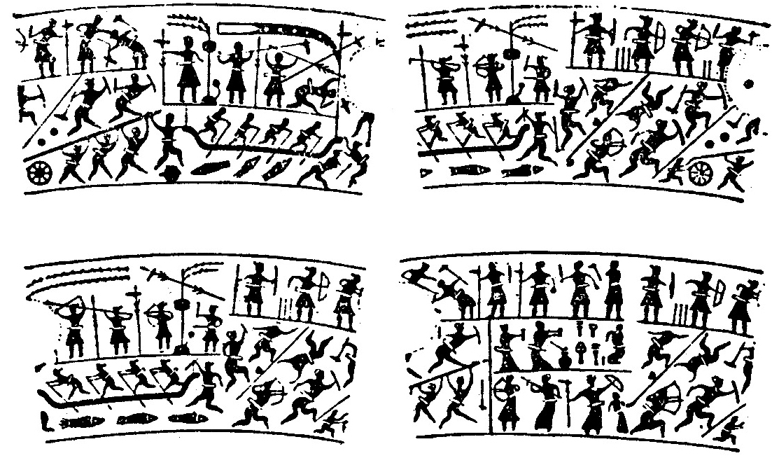 水陆攻战纹铜鉴是河南汲县山彪镇战国墓葬所出土。鉴腹四周有水陆攻战图案,用红色金属镶嵌而成。这里摹绘的是全图的一部分。战士都帻首、束腰、佩剑,所用的武器有弓矢、戈、戟、剑、盾、云梯、弹石等,指挥作战用的工具有旗、鼓、等。画中除描写战争场面外,还有犒赏、送别等情景的描写。