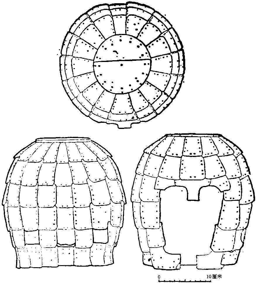 铁冑,一九六五年河北省易县燕下都四十四号墓出土。结构图采自河北省文物管理处《河北易县燕下都44号墓发掘报告》,《考古》一九七五年第四期。