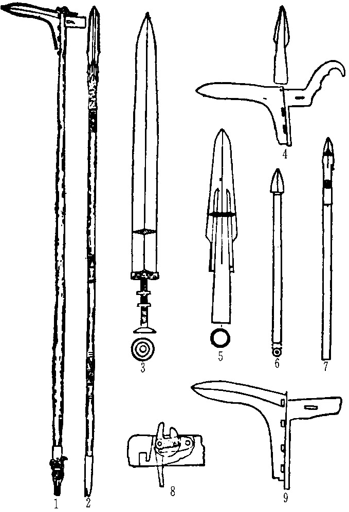 1.9.戈 2.5.矛 3.剑 4.戟 6.7.镞 8.弩机的拨机结构