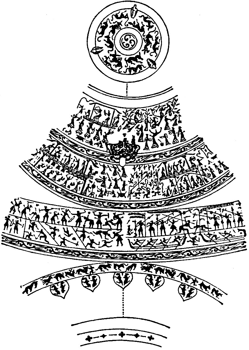 壶系一九六五年四川成都百花潭中学十号墓出土。高四十点六厘米,口径十三点四厘米,底径十四点二厘米,重四点五公斤。现藏四川省博物馆。画像分三层:第一层右方采桑,左方习射;第二层右方弋射飞雁和习射,左方宴饮和歌舞、音乐;第三层右方舟师交战,左方攻防战。摹本采自四川省博物馆《成都百花潭十号墓发掘记》,《文物》一九七六年第三期。