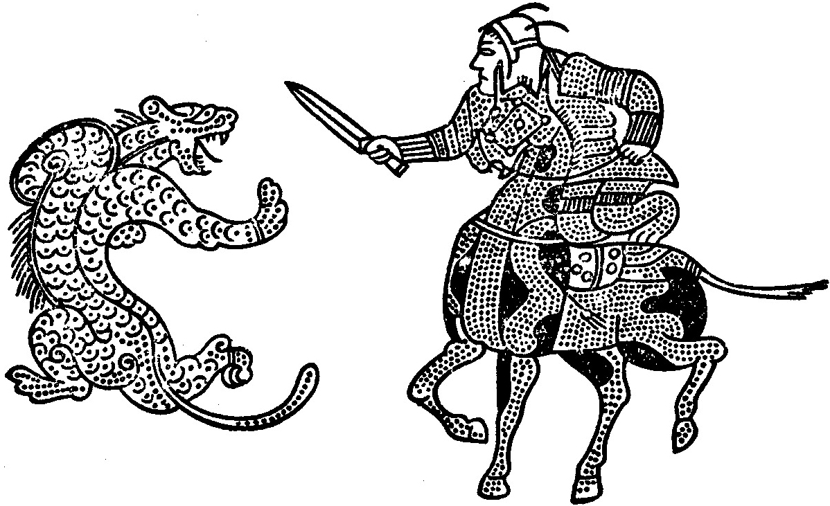 金银错铜镜,传河南洛阳金村出土。这是铜镜花纹的一部分,描写一个骑在马上的武士拿着匕首和虎搏斗的情景。这个武士头戴兜鍪,身穿皮甲,由此可看到当时骑兵的形象。