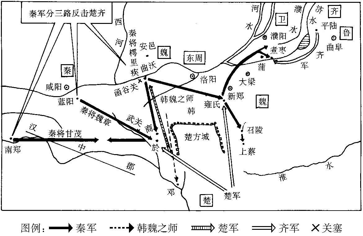 秦这时分三路出兵加以反击,东路由名将樗里疾统率,从函谷关进入韩的三川地区,帮助韩对围攻雍氏的景翠进行反包围;中路由庶长魏章统率,从蓝田(今陕西蓝田西)出发,经武关,到商於之地反击进攻的楚军。西路由甘茂统率[15],从南郑(今陕西汉中)出发,向东进攻楚的汉水流域,配合魏章一起攻取楚的汉中[16]。中路是主要的,首先由魏章在丹阳(今河南西峡丹水以北地区)大败楚军[17],斩首八万,俘虏楚将军屈丐、裨将军逢侯丑等七十多人(即《楚策一》所说“通侯执珪死者七十余人”),接着魏章由此向西进攻,与西路向东进攻的甘茂所部会合,攻取了楚汉中六百里地,设置汉中郡。东路樗里疾曾帮助魏章打败楚将屈丐,因而封为严君;又帮助韩反攻楚景翠所部得胜,接着就向东进发,帮助魏打败齐军于濮水一带,齐将声子(一作赘子)战死,齐将匡章败走[18]。樗里疾所统率的这支秦军穿越韩、魏二国,一直攻到魏的东北边。楚怀王因汉中失守而大怒,再发大军袭秦,一度深入到蓝田,结果又大败。韩魏因此又袭楚,攻到了邓(今湖北襄樊),迫使楚退兵。魏章还曾会合韩军攻楚,取得上蔡(今河南上蔡西南)[19]。