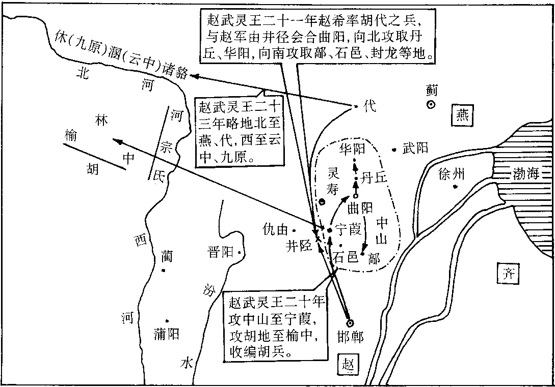 赵攻取中山和攻略胡地 公元前三〇七年赵攻中山到房子(今河北高邑西),次年攻中山到宁葭(河北石家庄西北),西略胡地到榆中,“林胡王献马”,由代相赵固“主胡,致其兵”。榆中在秦上郡之北,北河以南,今陕西榆林以北地区,原为林胡游牧地区,因有广大的榆柳之林而得名,林胡这个部族就因游居在榆中而得名。“林胡王献马”,就是表示从此归属于赵国。“代相赵固主胡”,就是从此由赵固兼管这个林胡部族,“致其兵”就是收编林胡的军队。公元前三〇五年赵大举攻中山,由武灵王亲率右、左、中三军,并由牛翦率车骑,赵希统率林胡和代的军队,会合于曲阳(今河北曲阳西北),向北攻到恒山的华阳,向南攻到石邑、封龙(今石家庄西南)、鄗(今高邑东)等地。次年攻取了榆中以北黄河上游河宗氏和休溷诸貉之地,设置了九原郡和云中郡。“命吏大夫奴迁于九原(今内蒙古包头西北),命将军、大夫、適(嫡)子、戍吏皆貉服”(《水经·河水注》引《纪年》魏襄王十七年,《今本竹书纪年》“戍”改作“代”,“貉”改作“貂”)。因为这一带居住民是貉族,因而穿貉服。貉服和胡服大概是大同小异的。公元前三〇三年又攻中山,攘地北至燕,西至云中、九原。公元前二九七年赵武灵王巡行新得之地,“出代,西遇楼烦王于西河而致其兵”,就是收编了楼烦的军队。次年中山灭亡,迁其君于虏施(今陕西榆林南)[7]。赵武灵王不但推行了胡服骑射,攻取得大片胡地和中山土地,而且收编了林胡和楼烦的军队,因而军事力量大为加强。
